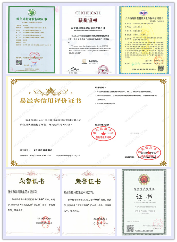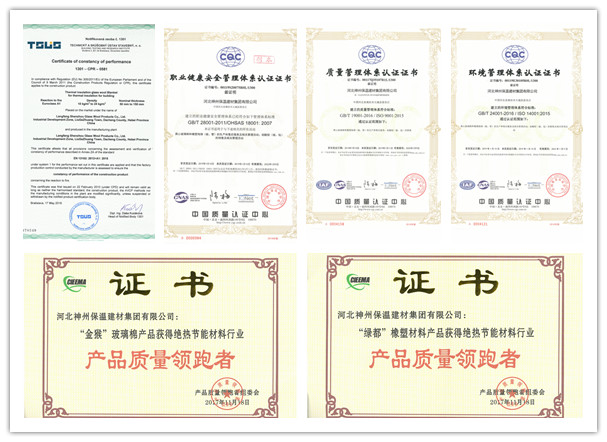 目前神州集團(tuán)所規(guī)定的產(chǎn)品和各項(xiàng)指標(biāo)均已超出國(guó)際要求。先后通過(guò)了ISO9001質(zhì)量管理體系、ISO14001環(huán)境管理體系、OHSAS18001職業(yè)健康及安全管理體系認(rèn)證,美國(guó)FM認(rèn)證、韓國(guó)KS認(rèn)證、中國(guó)CQC認(rèn)證、十環(huán)認(rèn)證。通過(guò)英國(guó)BS476:Part7:1997測(cè)試,美國(guó)ASTM E84測(cè)試。榮獲阻燃制品標(biāo)識(shí)使用證、建材防火環(huán)保標(biāo)識(shí)使用證、橡塑,玻璃棉均獲得“產(chǎn)品質(zhì)量領(lǐng)跑者證書(shū)”。